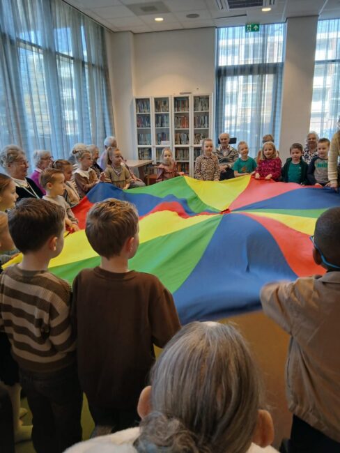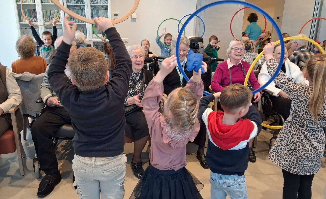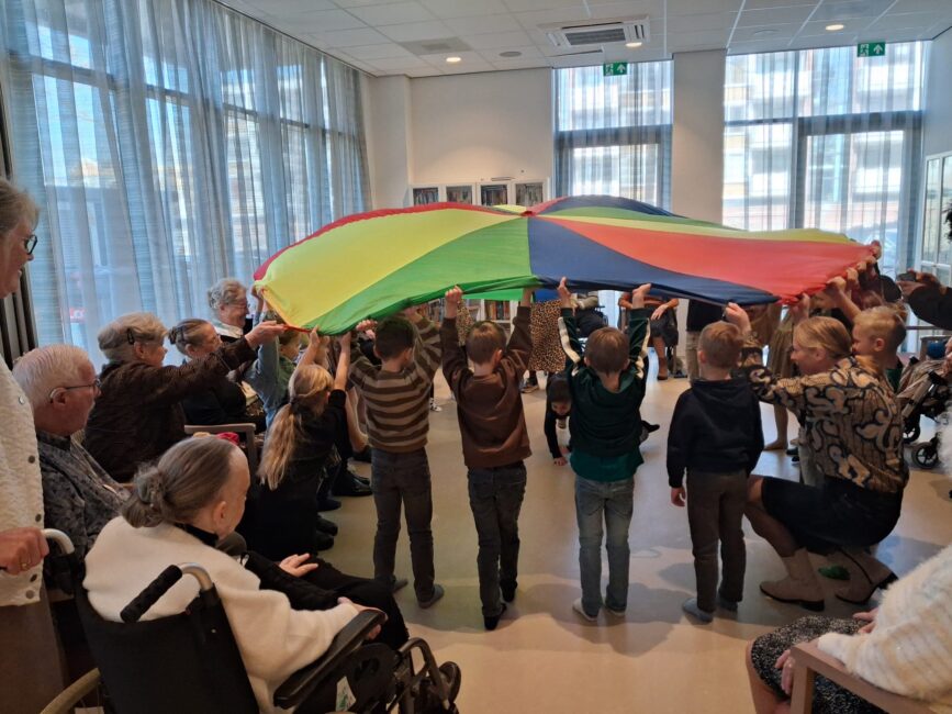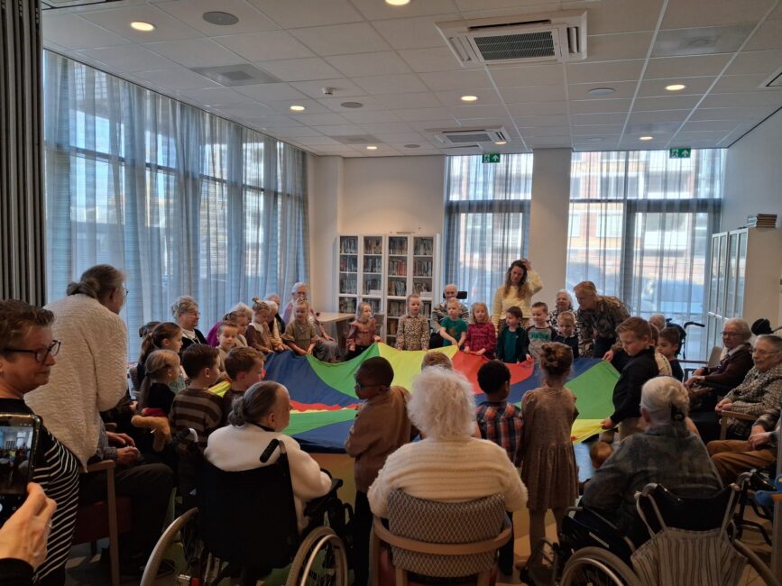 Tijdens het zogenoemde ‘centraal bewegen’ brachten kleuters van groep 2B een bezoek aan de bewoners. Achttien ouderen zaten klaar om hun jonge gasten te ontvangen, terwijl vijfentwintig kinderen plaatsnamen in een kring in het midden van de ruimte. De ochtend begon met het bekende lied Hoofd, schouders, knie en teen, waarbij de kinderen enthousiast de bewegingen voordeden. De bewoners deden op hun eigen tempo mee. Na enkele herhalingen volgde een speelse activiteit met een parachutedoek. Onder luid gelach bewogen de kinderen het doek op en neer en kropen er uiteindelijk onderdoor.