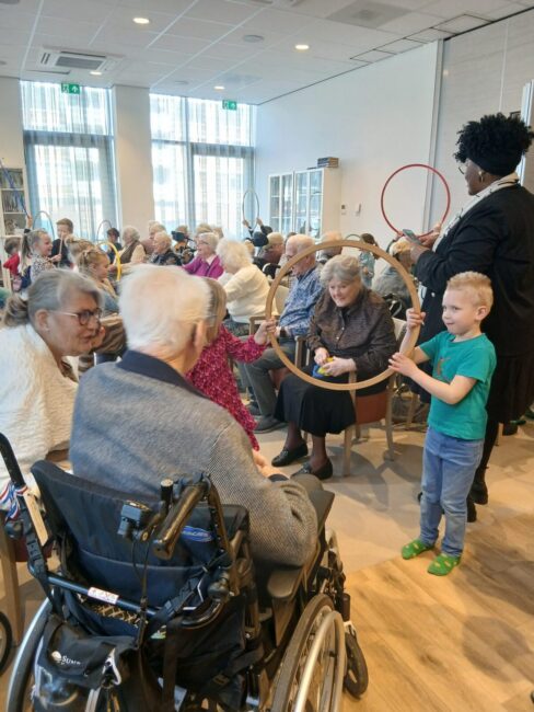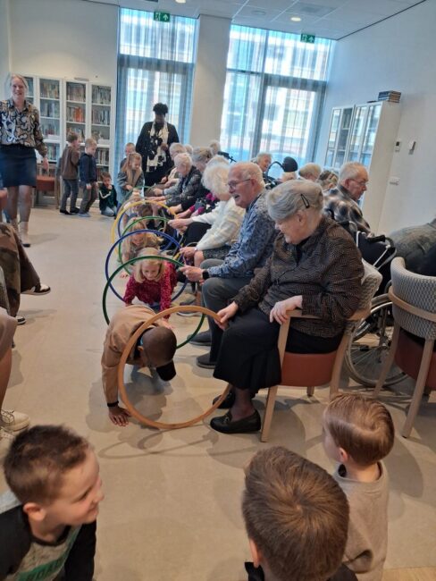 De uitdaging werd vervolgens vergroot met een bal op het doek, terwijl er Varen varen over de baren werd gezongen. Samenwerking was essentieel: de bal mocht immers niet op de grond vallen. Jong en oud werkten nauw samen om dit te laten slagen. Ook andere oefeningen zorgden voor interactie en plezier. Bewoners vormden met hoepels een tunnel waar de kinderen doorheen kropen en probeerden daarna pittenzakken door de hoepels te gooien. Aanmoedigingen als “Oma, opa, nog een keer!” klonken door de ruimte. De activiteit werd feestelijk afgesloten met een traktatie. De bewoners genoten van een ijsje met advocaat en slagroom, terwijl de kinderen smulden van roomijs.